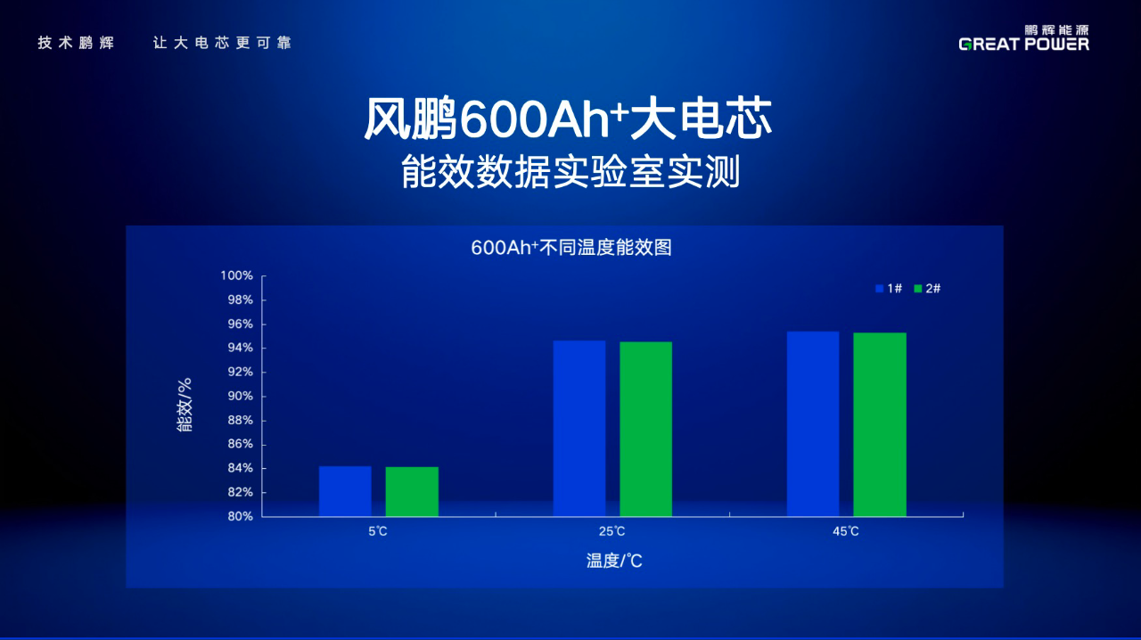 根據(jù)實(shí)驗(yàn)室實(shí)測數(shù)據(jù),目前階段風(fēng)鵬600Ah+大電芯已實(shí)現(xiàn)全溫域高能效,在5℃時(shí),能效超84%;25℃時(shí),能效超94.5%;45℃時(shí),能效接近96%。同時(shí),隨著研發(fā)體系持續(xù)迭代,風(fēng)鵬大電芯能效數(shù)據(jù)有望持續(xù)躍升。