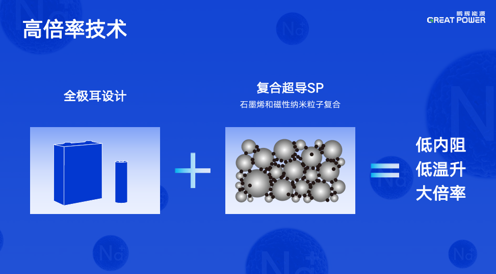 鵬輝能源Great Power研發(fā)的新一代聚陰離子體系具有高安全、長循環(huán)的性能優(yōu)勢。同時(shí),基于不同形態(tài)鈉電產(chǎn)品可實(shí)現(xiàn)差異化性能,比如圓柱鈉電,結(jié)構(gòu)采用全極耳設(shè)計(jì),并通過超導(dǎo)SP應(yīng)用,實(shí)現(xiàn)石墨烯和磁性納米粒子復(fù)合,實(shí)現(xiàn)20C高倍率持續(xù)放電,滿足啟停等細(xì)分場景應(yīng)用需求。