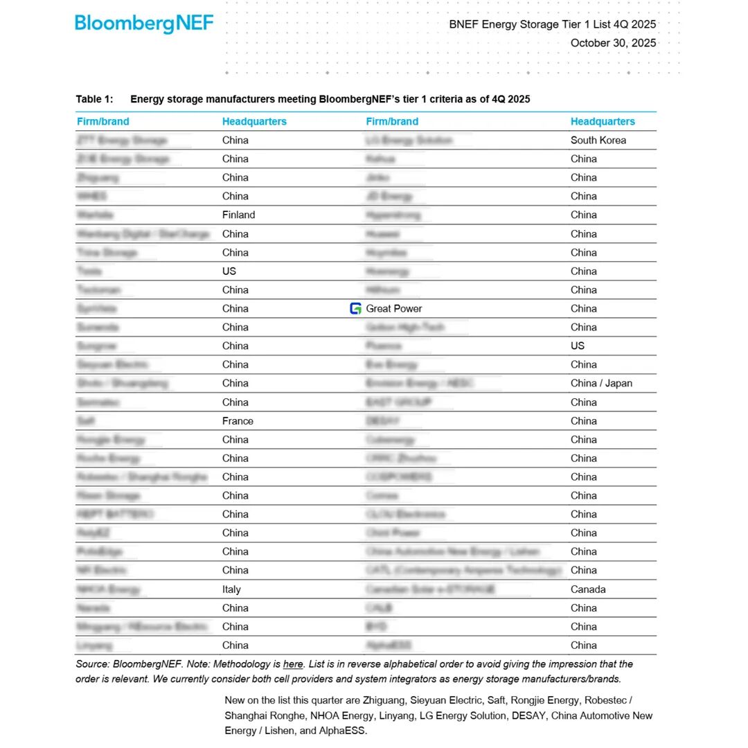10月31日,全球權(quán)威研究機構(gòu)BloombergNEF(彭博新能源財經(jīng),簡稱BNEF)正式發(fā)布2025年第四季度全球Tier 1一級儲能廠商榜單(BNEF Energy Storage Tier 1 List 4Q 2025),鵬輝能源連續(xù)六季度榮登榜單。